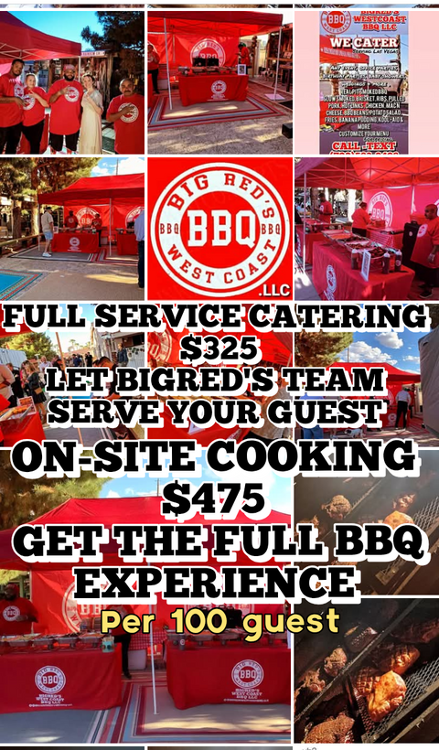 Whether you’re hosting a party at home or the office BIGRED'S WESTCOAST BBQ LLC has all your BBQ favorites and more .. bringing you incredibly flavored BBQ that gives you the feel your at a backyard BBQ in your old neighborhood .. BIGRED'S team will deliver the food and setup a table for service. Whats included? Buffet Warmers, sterners, all serving spoons and tongs, plates, napkins all utensils etc... All equipment will be picked up at the end of your event. Full service catering is available also on-site cooking