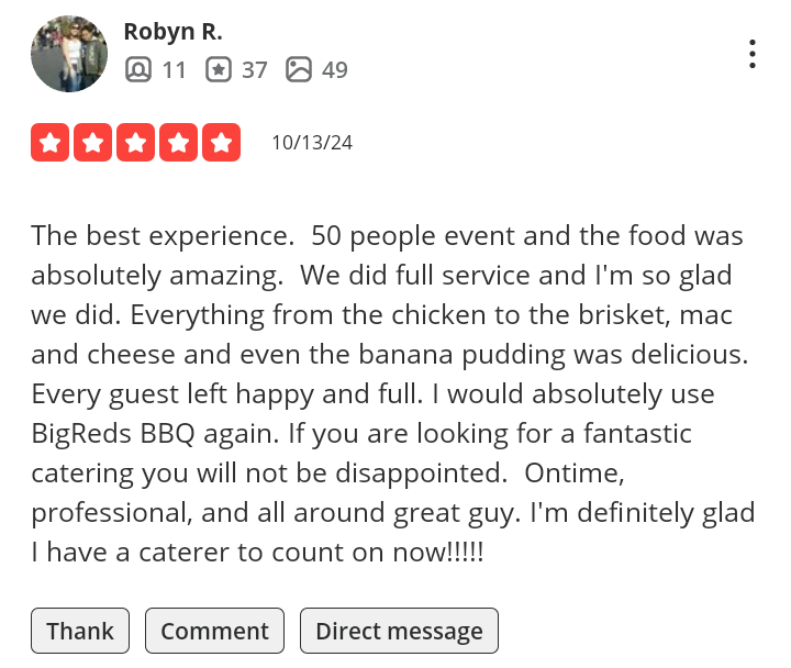 Looking for the full catering experience look no further BIGRED'S got you covered. let our team serve your guest , no party too small or too big. Once the food is ready and is set up ITS TIME TO EAT ..form a line at our booth and each one of your guests will be served with a smile 😁 Full service catering starts @ $250 per 100 guests